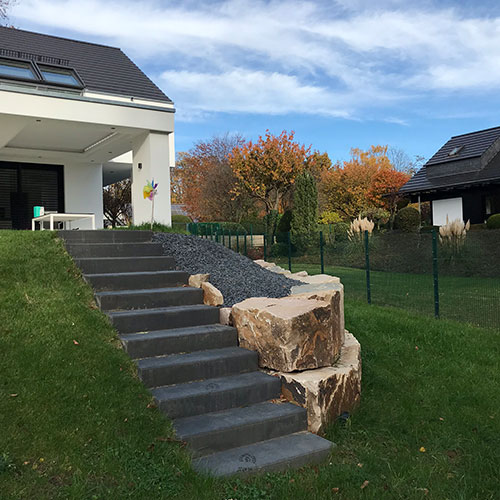 • Treppe und Natursteinmauer zum Abfangen des Gebäudes